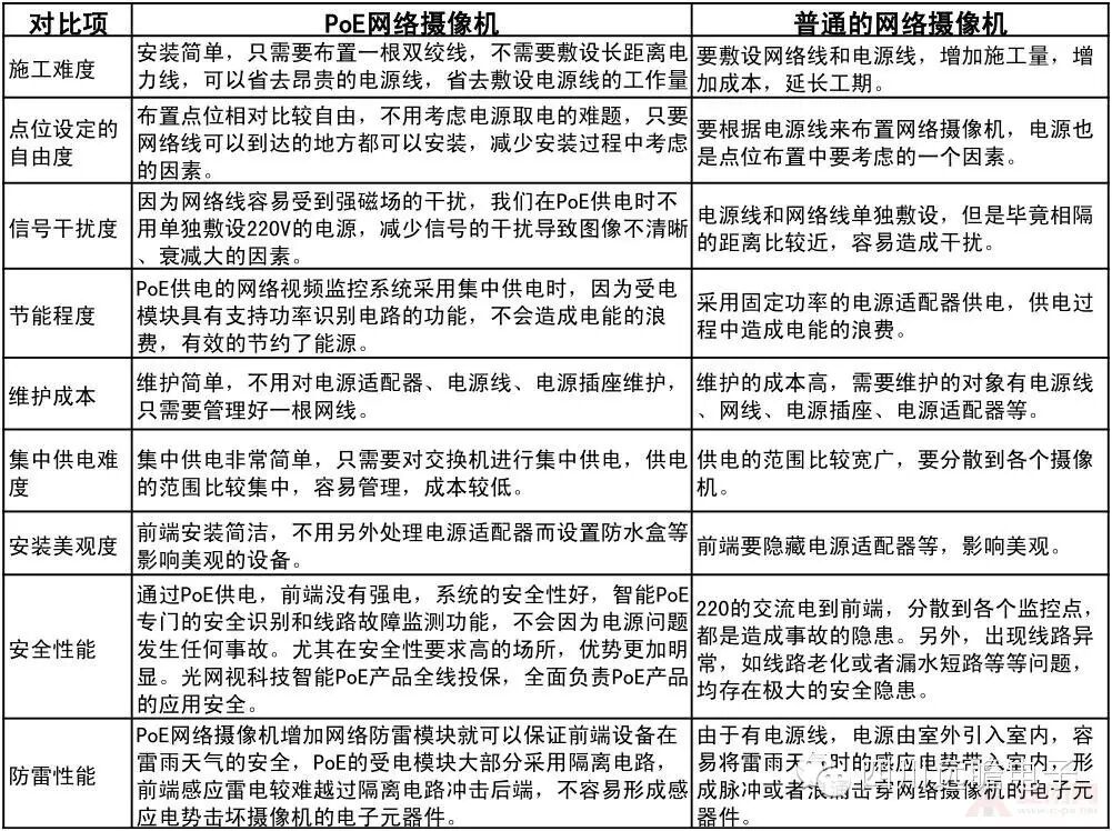 下表列出了在具体工程应用中PoE网络摄像机与普通网络摄像机的对比效果。