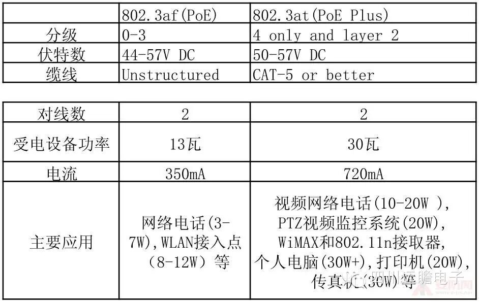 与IEEE802.3af相比,IEEE802.3at可输出2倍以上的电力,每个端口的输出功率可在30W以上,因此可大幅拓宽PoE的应用领域。表1为IEEE802.3af与IEEE802.3at的对比。