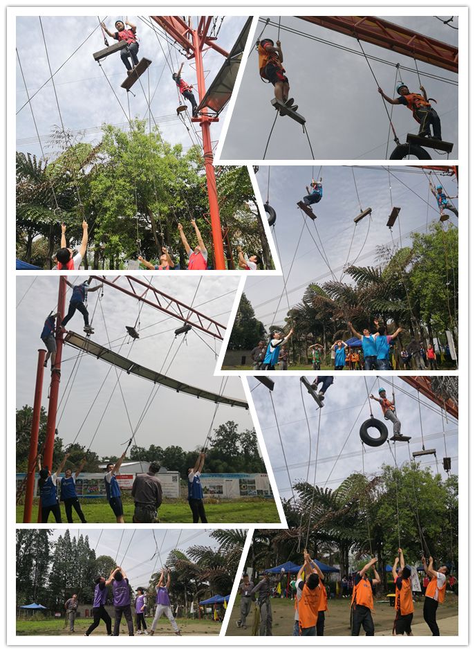 在9米的高空中,有8个形状各异、不同间隔且摇晃不平的物体,2名队员一组相互配合依次从高空中的起点走向终点,地面团队的其他成员分别抓住高空物体垂下的绳子,以协助高空中的队员顺利通过。
