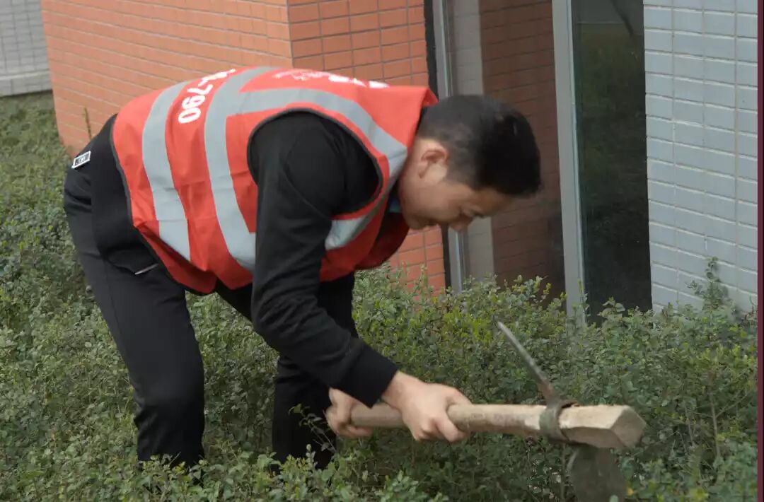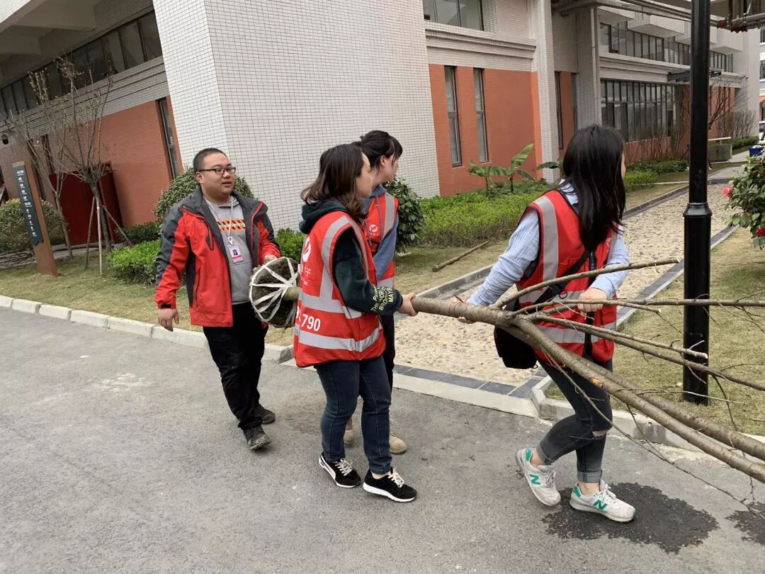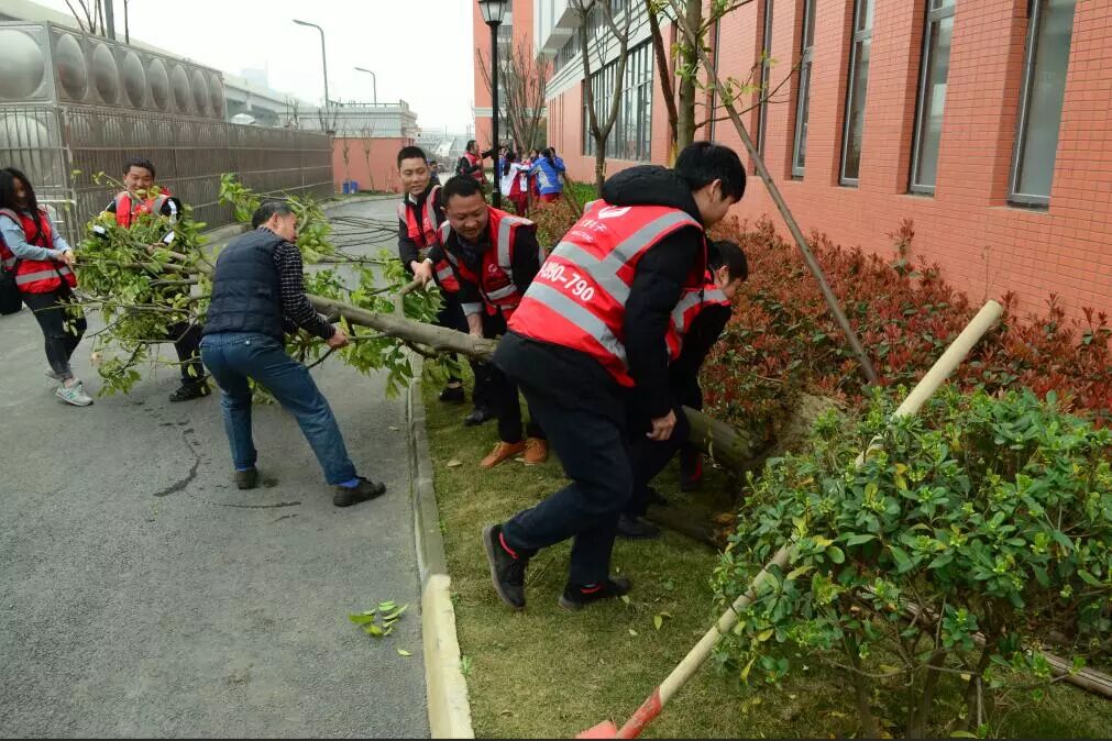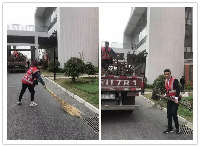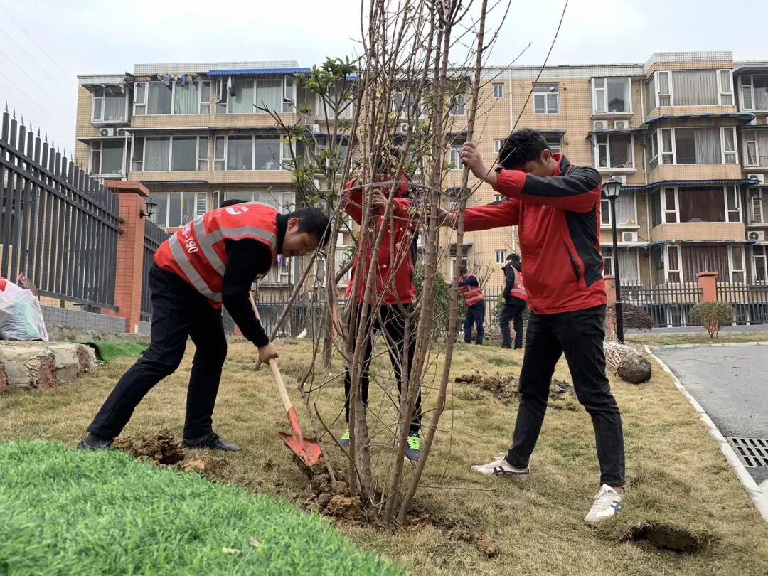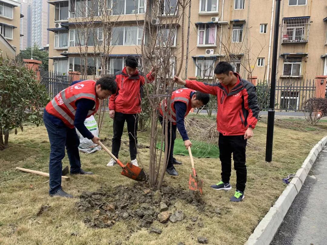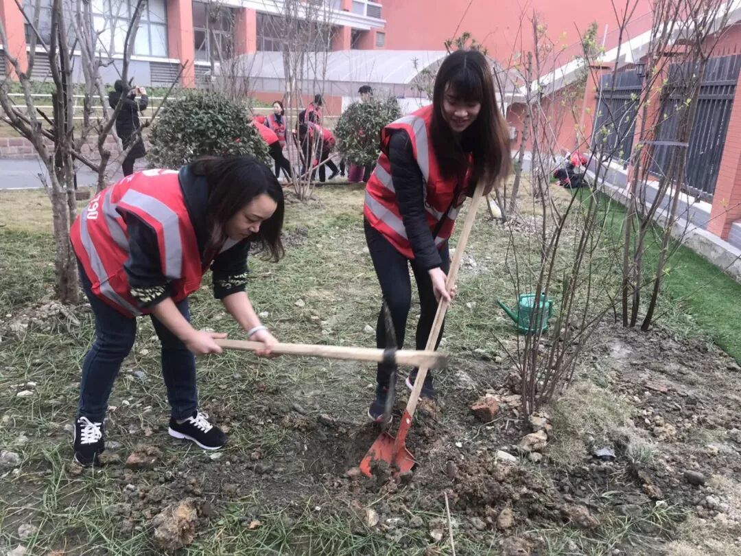 腊梅树栽种完成,伙伴们齐心协力清理学校原有的枯树。继续为教学楼四周种上樱花树。